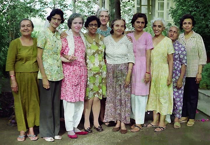 The women disciples in the early days. Korshed, Nargis, Mehera, Mani, Katie, Arnavaz. Seated: Goher, Meheru and .... and (Mansari not shown).